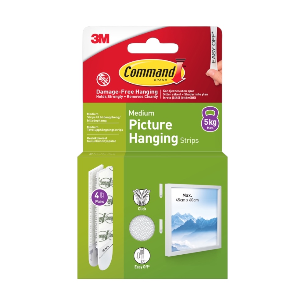 3M Command Strips White Medium 4 Sets on nutikas ja seinasõbralik lahendus esemete kinnitamiseks ilma puurimise, kruvide ja kahjustusteta. Tänu 3M venitusvabastuse tehnoloogiale püsivad ribad kindlalt paigal, kuid eemaldamisel ei jäta seinale auke, kriime ega kleepuvaid jääke.