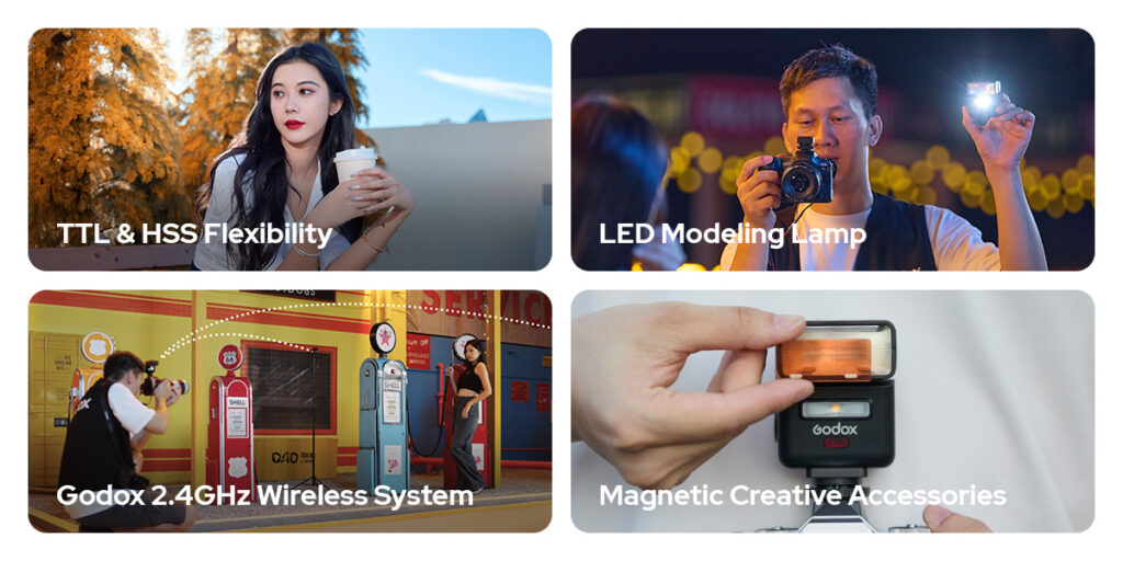 iT32 kasutab Godoxi 2.4 GHz X raadiosüsteemi, mis tagab stabiilse signaali ja töökindluse ka keerukamates tingimustes. See toetab TTL-, M- ja Multi-režiime, HSS-i, värvilist puutetundlikku ekraani ning LED-modelleerimisvalgust. Tänu sisseehitatud USB-C laetavale akule pakub iT32 kuni 510 täisvõimsusvälku, jäädes ise ülikergeks — vaid 170 g.